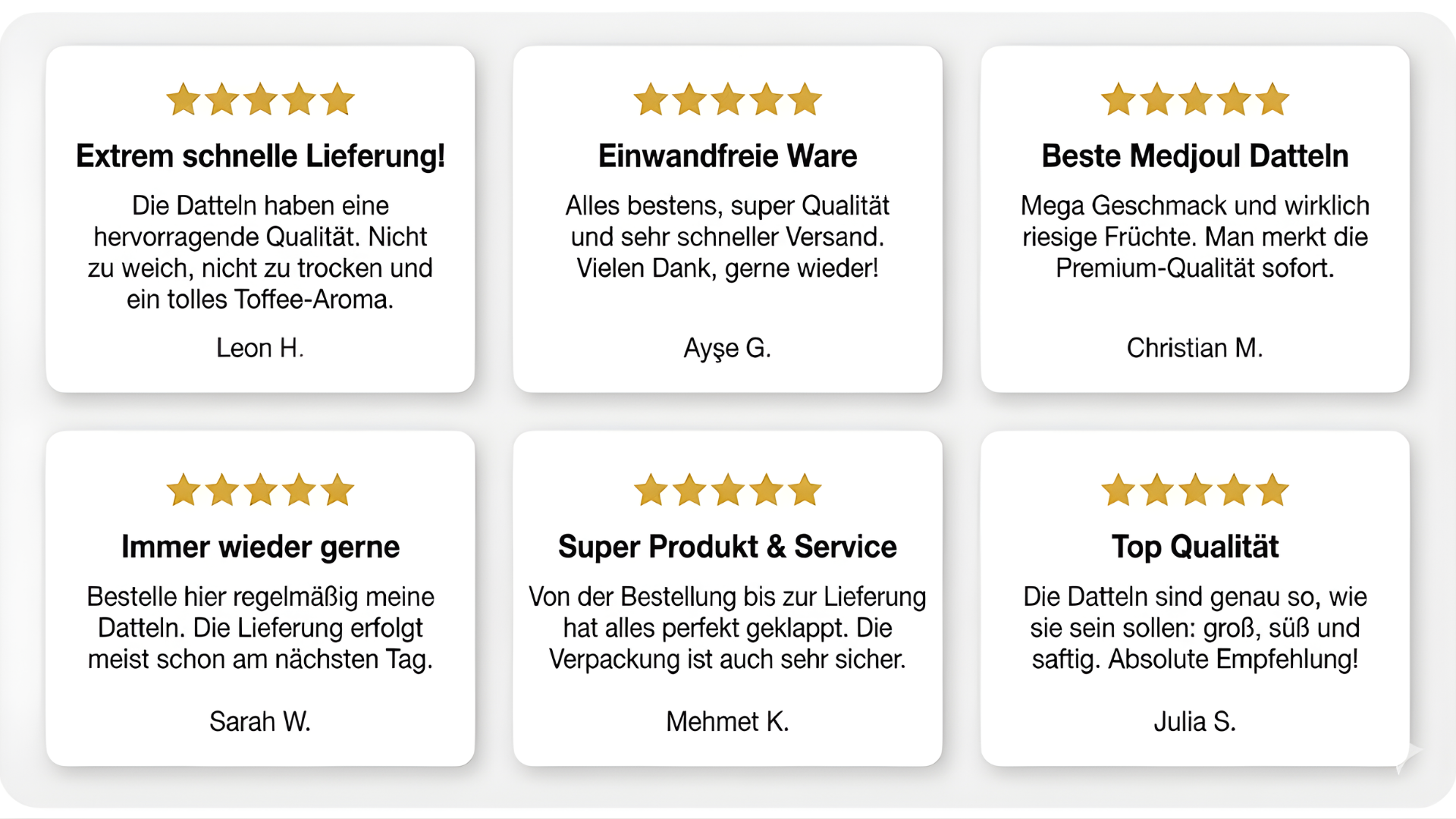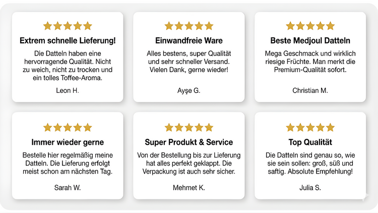 Jede Charge wird sorgfältig geprüft, damit du gleichbleibend hochwertige Medjoul-Datteln erhältst – frisch, aromatisch und in bewährter Datteldreams Qualität.
